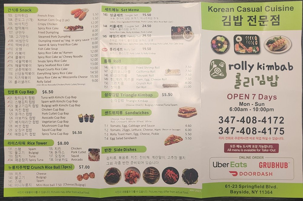 Rolly Kimbab in Bayside, NY is a hidden gem for Korean cuisine lovers. Offering a wide variety of kimbab, cup babs, and rolls, this place is a go-to spot for locals. Customers rave about the customizable options, generous portions, and top-notch service. From the flavorful Rolly Kimbab filled with ham, egg, and vegetables to the delicious Shrimp Tempura Roll, each dish is a delight for the taste buds. The menu caters to all preferences, including vegan and vegetarian options. Whether you're grabbing a quick bite or catering for an event, Rolly Kimbab is sure to impress with its authentic flavors and affordable prices. Don't miss out on their must-try dishes like the Ham, Egg, and Cheese Kimbap and Bulgogi Cup Bab.